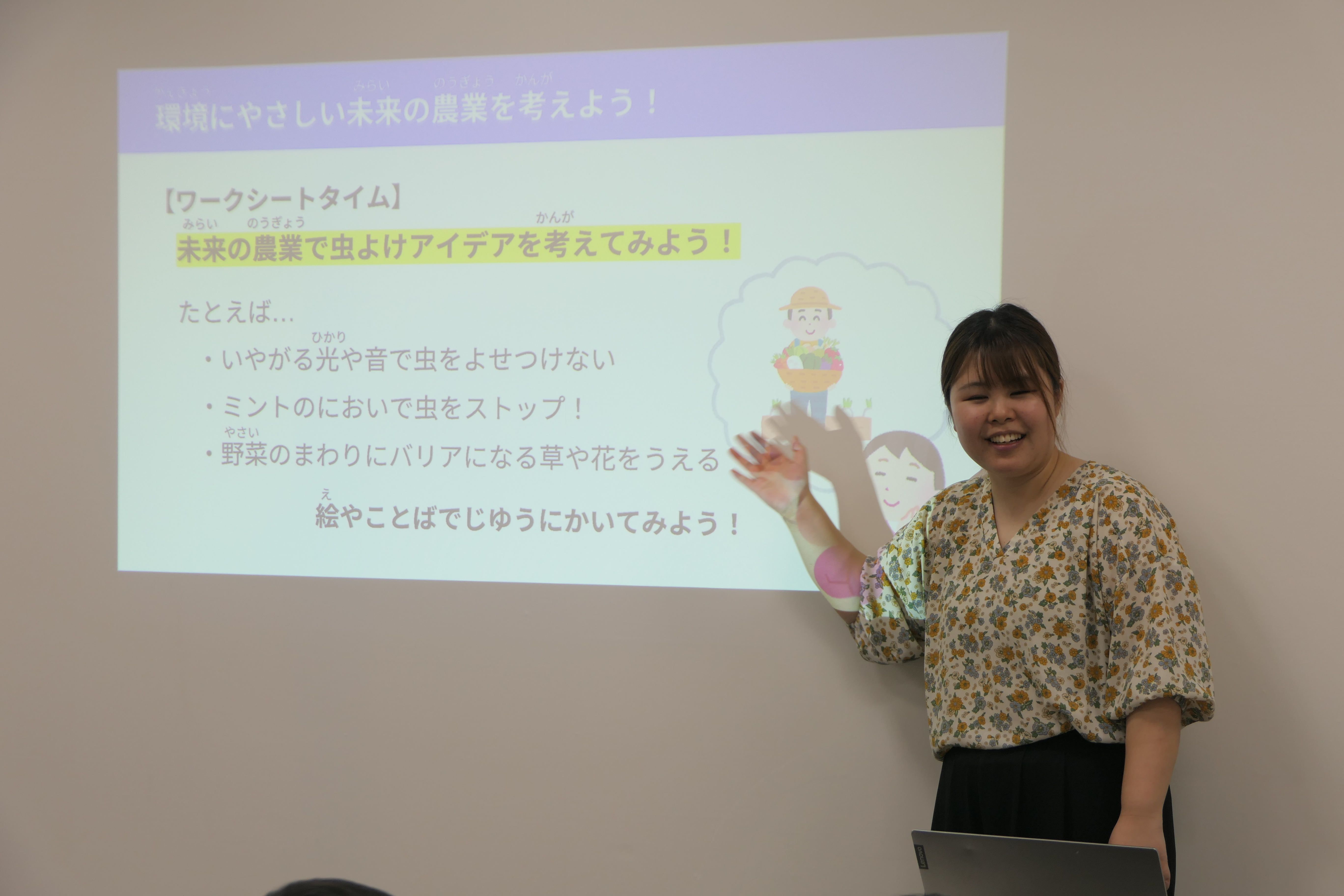 次に、「虫から作物を守るには、どんな方法が考えられる?」というテーマで、、子どもたちに自由にアイデアを書いてもらいました。
